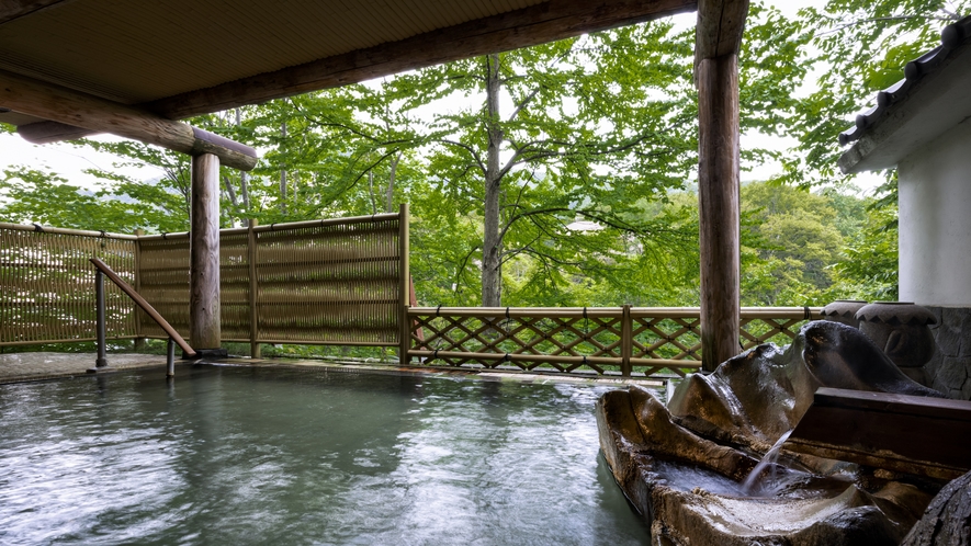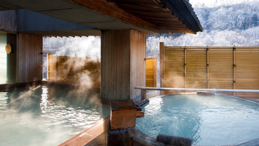 高台の露天風呂に浸かれば、足元には渓谷、頭上には秋空。まるで大自然に抱かれるような心地よさ。