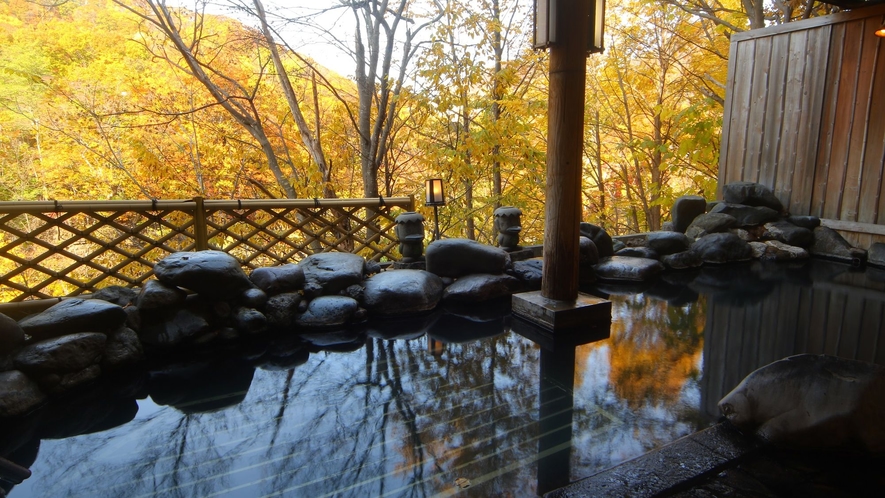 温泉街のにぎわいを少し離れて、心ゆくまで秋を感じる時間。泉質の異なるお湯を楽しめるのも登別ならではです。